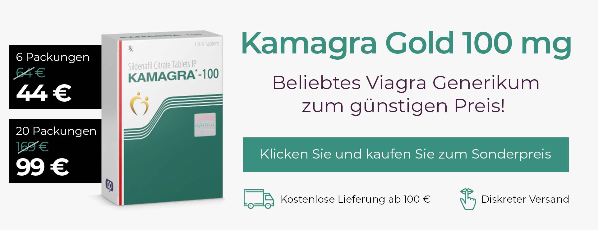 Kamagra Gold 100 mg gehört zu den bekanntesten Generika (vollwertiger Ersatz) von Viagra. Mit Hilfe von Wirkstoff Sildenafil können Erektionsstörungen sehr gut in den Griff bekommen werden. Die Tabletten werden durch die modernsten Technologien in Laboratorien der indischen Pharma Gesellschaft Ajanta Pharma Limited hergestellt.